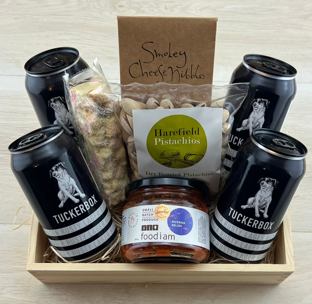 • Tuckerbox Lager by Borambola Wines- Four cans of premium Tuckerbox Larger from local winery Borambola.